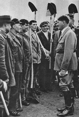 “One and all feel that they posses a personal link with their Führer. He addresses workers in their own factories, and chats with farm hands during harvest time. An informal and frequent scene during road building operations when the Führer chats to road workers!”