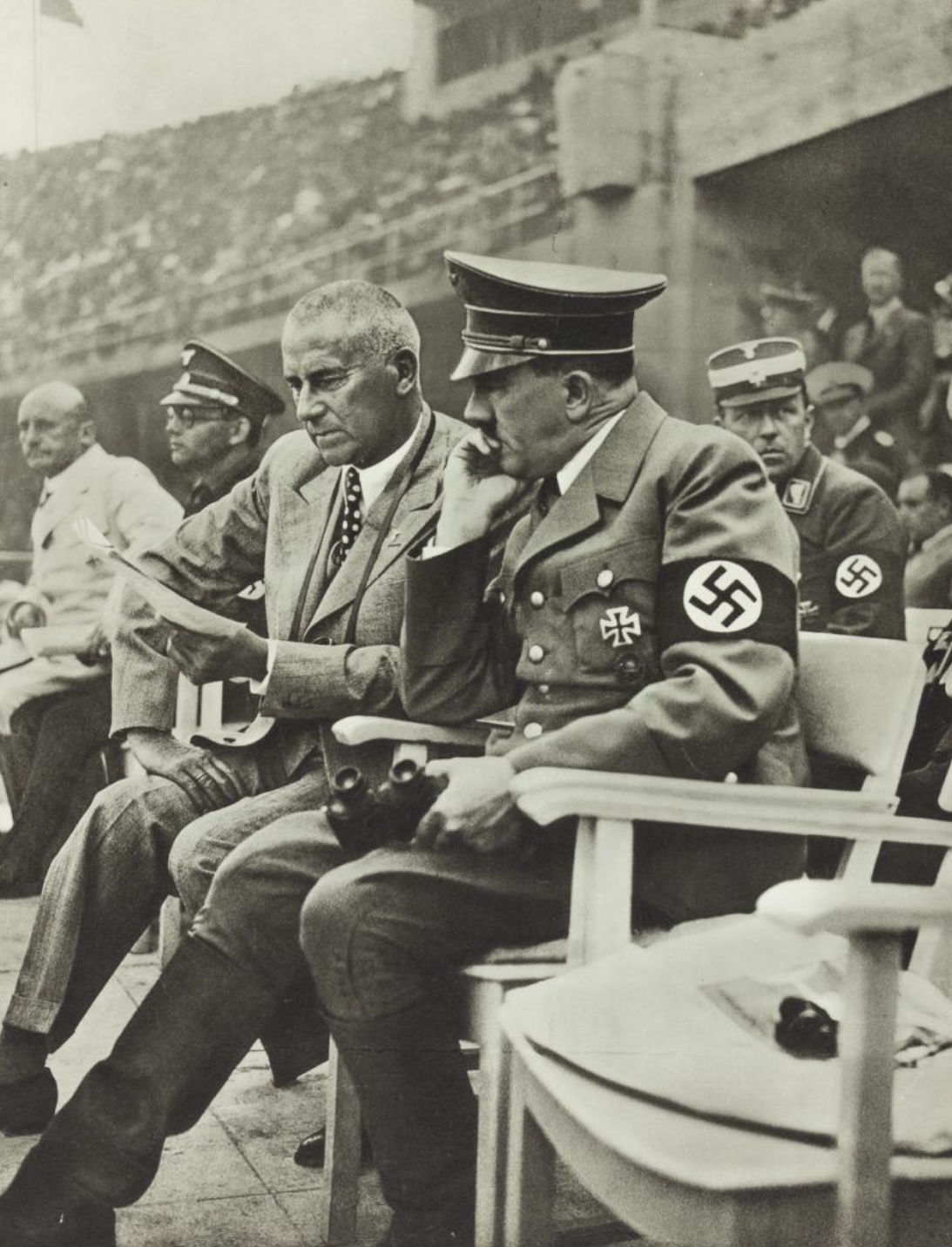 August 1936: Adolf Hitler watching the Olympic Games in Berlin with  Crown Prince Umberto of Italy.