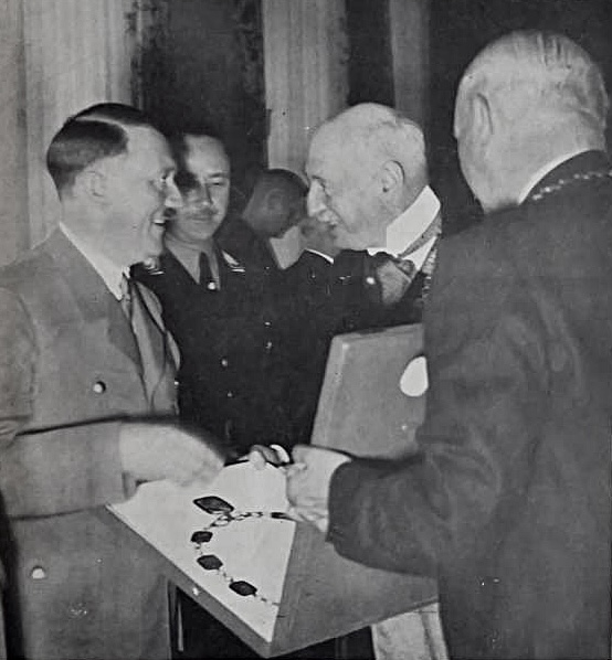 Reception of the IOC. and OC. (International Olympic Committee and Organizing Committee) with the Führer in the Reich President’s Palace with Henri de Baillet-Latour and Theodor Lewald on 1 August 1936. Hitler is presented with his own gold “Chain of Honor” designed by sculptor Walter E. Lemcke and gifted to each of the Members of the International Olympic Committee.