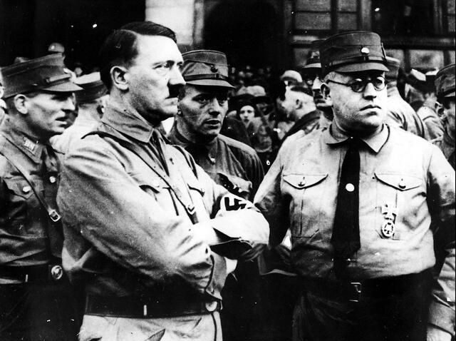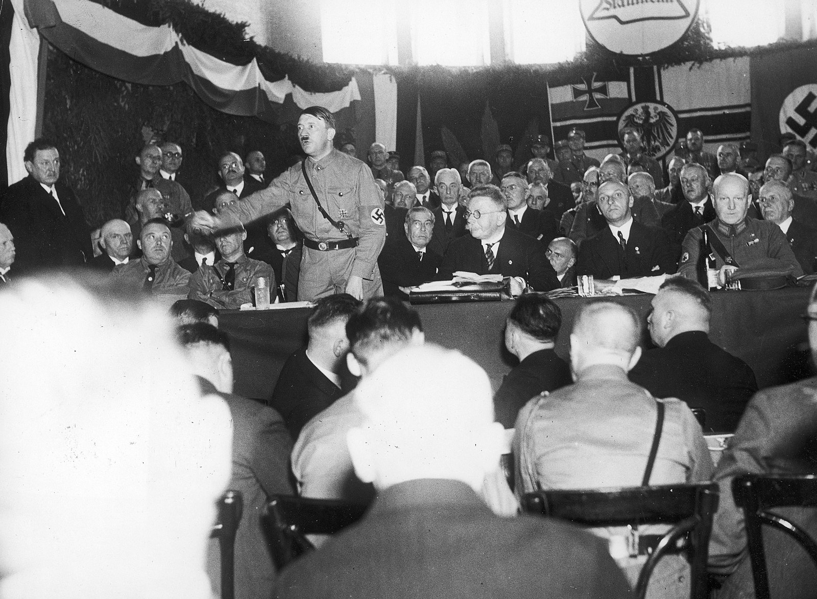 Adolf Hitler, Rudolf Hess, and the head of the SA Franz Pfeffer von Salomon attend a speech of Privy Councilor Alfred Hugenberg in the Munich Circus Krone on 29 October 1929. The occasion of this speech was the referendum against the adoption of the Young Plan to regulate payment of the war reparations debt.