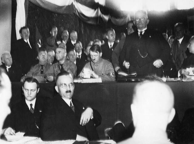 Adolf Hitler (at the table 4th from left), Alfred Hugenberg (right beside him ) and other representatives of right-wing parties at the foundation of the anti-republican Harzburg Front.