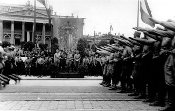 On 16 July 1933, the Sachsentreffen Gauparteitag took place in Leipzig. Hitler delivered two speeches at what was known as the “Saxon Meeting,” the Gau Party Congress of Saxony held in Leipzig. At the imposing Völkerschlachtdenkmal monument, constructed to commemorate the Battle of the Nations of 1813, Hitler announced to 140,000 men of the SA, SS and the Stahlhelm that they were to become “soldiers of our Weltanschauung” (Worldview). A massive parade was also held in the main city square, the Augustusplatz, of Leipzig. There Hitler stated before a gathering of 25,000 Amtswalters that “The religions and the Churches will maintain their freedom. But we are in charge of politics.” Just ten days prior to the Party Congress, at a gathering of high-ranking Nazi officials in Berlin, Hitler had declared the success of the National Socialist seizure of power; this was now the time to consolidate its control.