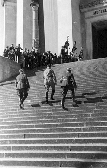 After expressing his gratitude in a short speech, Hitler, accompanied by Röhm and Reich Governor Ritter von Epp, entered the hall and laid a large laurel wreath in memory of those killed in the Wars of Liberation. As the Reichswehr left the Liberation Hall toward the city center, it fired another 21-gun salute. During the lunch break that followed, the Führer was presented with the honorary citizenship certificate of the city of Kelheim by the mayor of Kelheim, Dr. August Donderer.