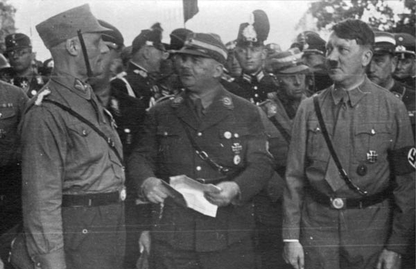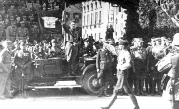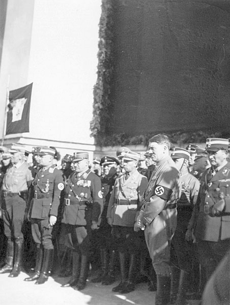 The events for the “Liberation Celebration” took place on a glorious autumn day. Around 11:00 a.m., the Führer arrived at the Befreiungshalle grounds in Gauleiter Adolf Wagner’s black Mercedes and was greeted by Chief of Staff Ernst Röhm, who inspected the SA front line in front of the hall. Following the firing of a 21-gun salute to welcome the Führer, Chief of Staff Röhm presented the Nazi Party insignia, featuring the swastika, displayed on the Liberation Hall (colloquially known as the “Hen Vulture” above the entrance door), to Adolf Hitler.