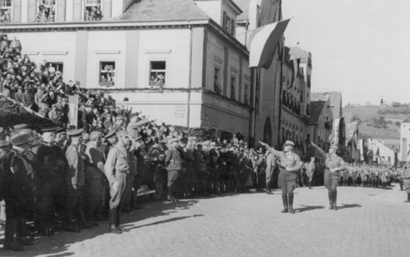 Hitler took about 18,000 SA and SS members to a march past on Kelheim’s town square after the Reichswehr fired another 21 gun salute. Coming from the Altmühltor, the ancient city gate, they marched for two hours in rows of six and in blocks of 500 men, each “with their hands raised” to Hitler. Five Reichsmarks had to be paid for a seat in the stands. It wasn’t until midnight that the festivities in the overcrowded town ended.