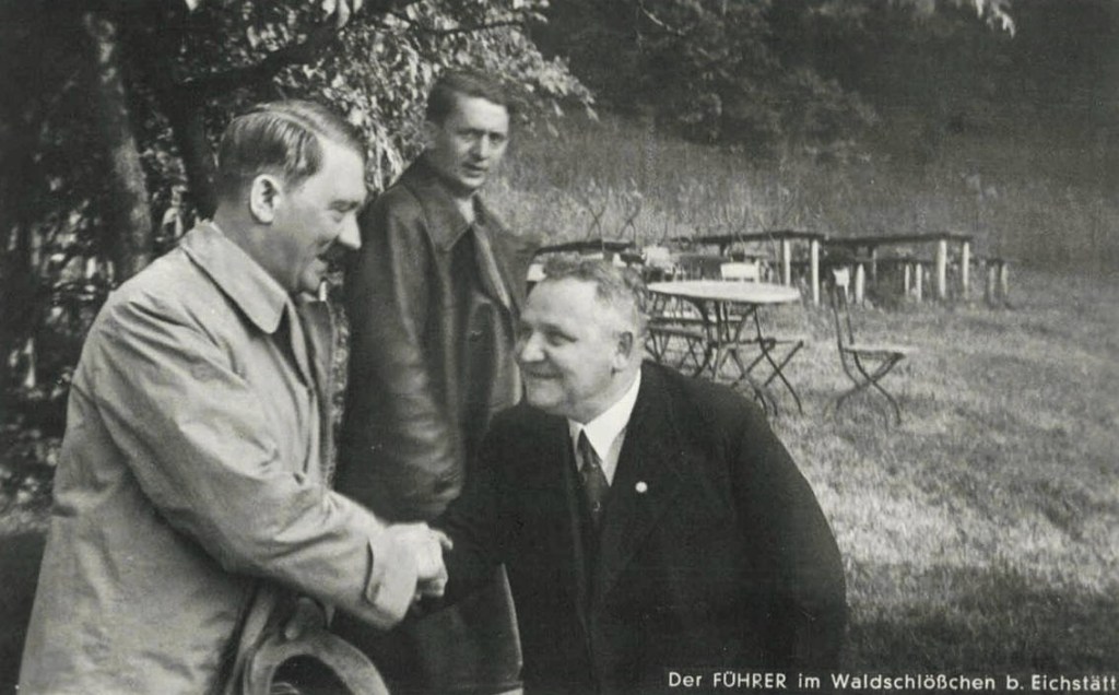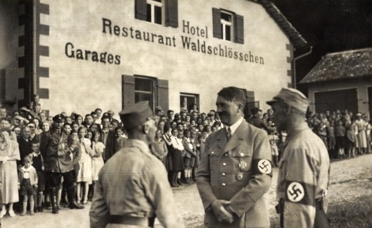 Hitler would often stop in the small town of Eichstätt on his frequent road trips north of Munich, especially to indulge in lunch or coffee at the Gasthaus Waldschlösschen. Hitler became a frequent guest at this hotel and restaurant after his first visit in 1923. On his journeys between Nuremberg and Munich in the early 1930’s he stopped several times at the former Waldschlösschen inn. Later this building (located at Ingolstädter Straße 54 next to the roundabout in the direction of Neuburg/Ingolstadt) was used as a factory hall. Today a printing house is now operated at this location, so it is difficult to determine if the following photo was taken at the the Waldschlösschen but it’s a possibility…