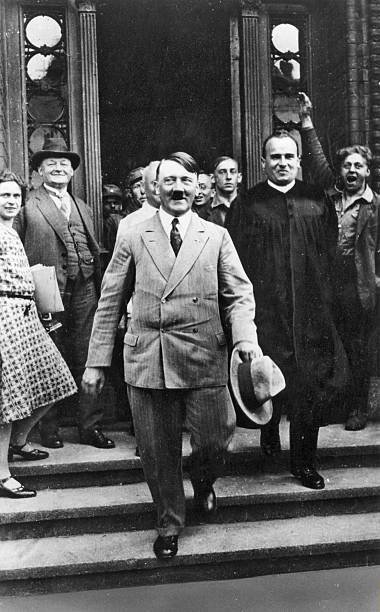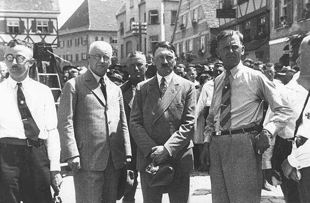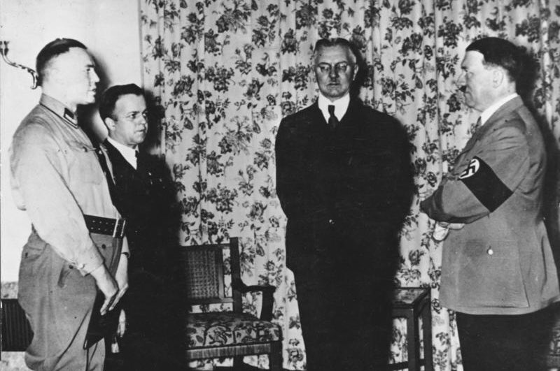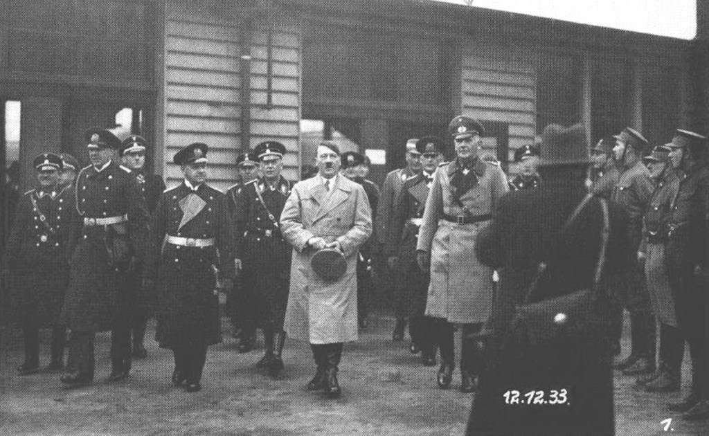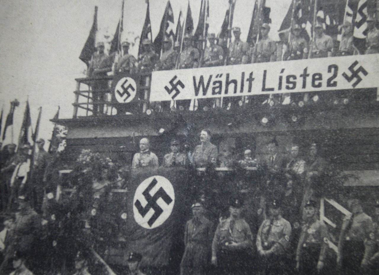 Hitler at the horse market in Oldenburg with several members of the National Socialist Oldenburg government on 5 May 1931. (from left to right) Heinz Spangemacher (Culture and Justice) and Carl RĂśver (Gauleiter of Gau Weser-Ems). Hitler fought hard to win over the area to vote NSDAP. One of the largest voting blocks to win over was Catholic. The pine cone artifact on Hitlerâs uniform may therefore be a play to the Catholic vote.