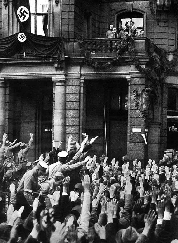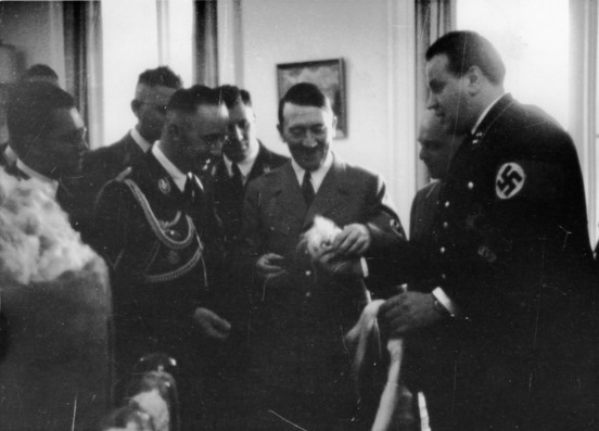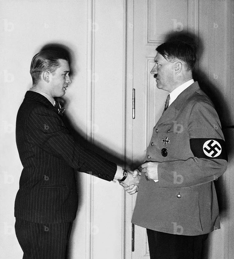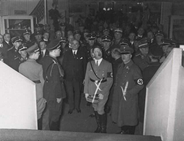 Adolf Hitler greets the film actor Willy Fritsch at a reception for artists held in the Reich Ministry for Popular Enlightenment and Propaganda on 1 April 1933. In the center of the photo is Maria Goebbels, the sister of the Propaganda minister Joseph Goebbels; to the left is Franz Moralla, head of the cultural office of the NSDAP, and to the far right: Ludwig KĂśrner, member of the Reichstheaterkammer. At this time in April 1933, the American film industry entered into cooperation with the NSDAP regime and committed itself to refraining from the production of any Hitler-critical films. Winifred Wagner was also invited to have lunch with Hitler at the Reich Chancellery on this day.