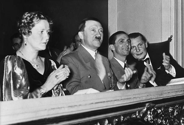 Ernst âPutziâ Hanfstaengl at the piano in Joseph Goebbels’ apartment, Berlin, 1932. Listening to him, on the left is Adolf Hitler, on the right Wilma Schaub, Magda Goebbels, Wilhelm BrĂźckner and Goebbels.