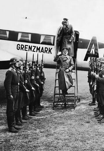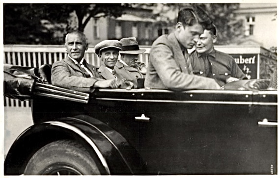 Adolf Hitler dons his leather flying cap and takes a ride to the airport with Heinrich Hoffmann during his fourth Deutschlandflug tour of Germany in the autumn of 1932. His fourth election campaign by air took place between October 11 and November 5, 1932. During this timeframe Hitler held a total of 50 speeches, sometimes even as many as three in one day.
