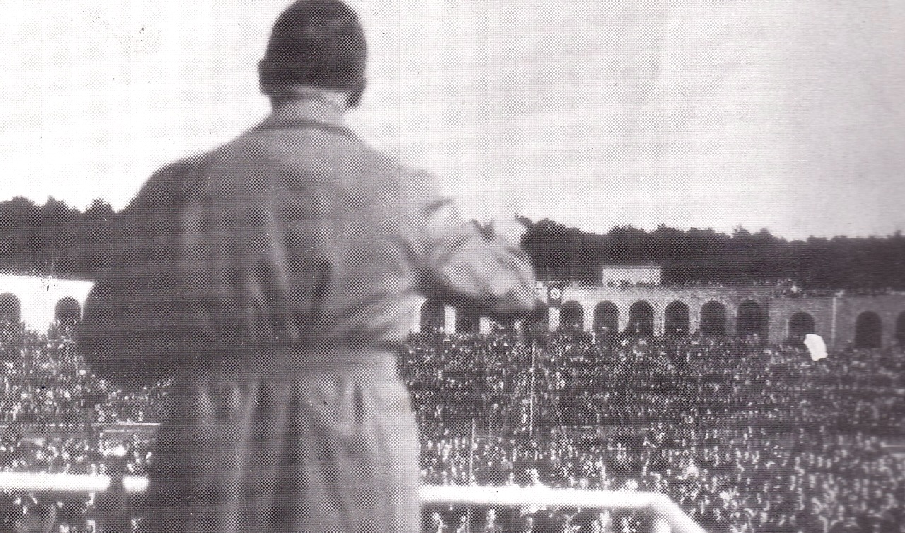 Adolf Hitler gives a speech on the Zeppelinfeld to the Reichsarbeitsdienst (Reich Labor Service) before 52,000 attendees at the Reich Party Congress in Nuremberg on 6 September 1934. This pair of photographs are attributed to American photographer Constance Stuart Larrabee. During her time in Munich, Larrabee photographed Nazi propaganda posters, swastika flags and documented party rallies and events. Long after the photograph was printed, someone, presumably the photographer herself, wrote âThe Cause of World War II ~ 1939 – 1945â onto it.