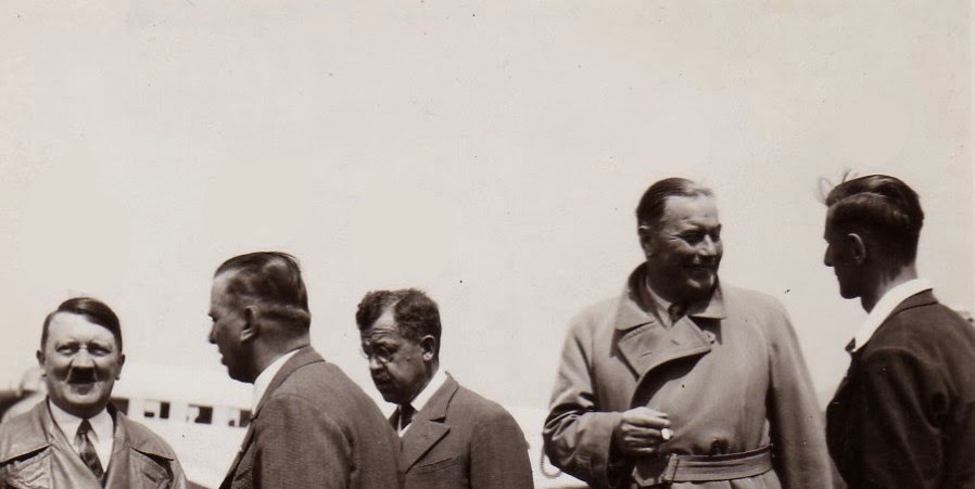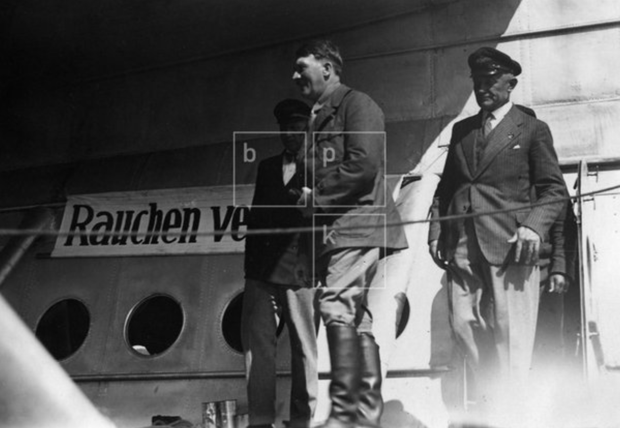 Adolf Hitler in Munich’s airport (Oberwiesenfeld) during the electoral campaign with his pilot Hans Baur, adjutants Julius Schaub and Wilhelm BrĂźckner, and Hermann Esser in October 1932.