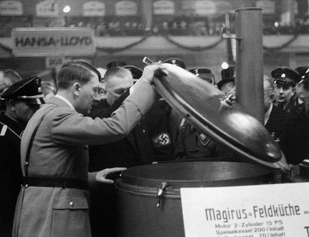 Adolf Hitler inspects a Magirus field kitchen (FeldkĂźche) during an exhibition in Cologne on 28 March 1936. The Magirus-FeldkĂźche was a mobile kitchen unit used by the German military for preparing food in the field. Hitler attended the Expo while attending a cerebration held in his honor following the Occupation of the Rhineland. The four Rhenish Gauleiters had organised a standing reception for Hitler in the Cologne borough of GĂźrzenich, to thank him for the remilitarization of the Rhineland.