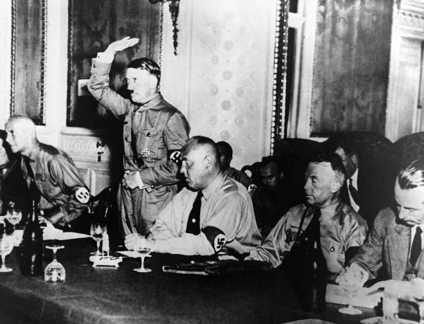 Adolf Hitler greets one of the new Nazi Reichstag members in Berlin on 29 August 1932 before giving a speech before the Nazi Reichstag faction in the Hotel Kaiserhof. Franz von Papen’s speech and the new Reichstag opening have paused the assembly of the new Nazi Reichstag delegates in the Hotel Kaiserhof, where Adolf Hitler has sworn them to the National Socialist program directions. The Nazi officers also take an oath of complete allegiance to Hitler.