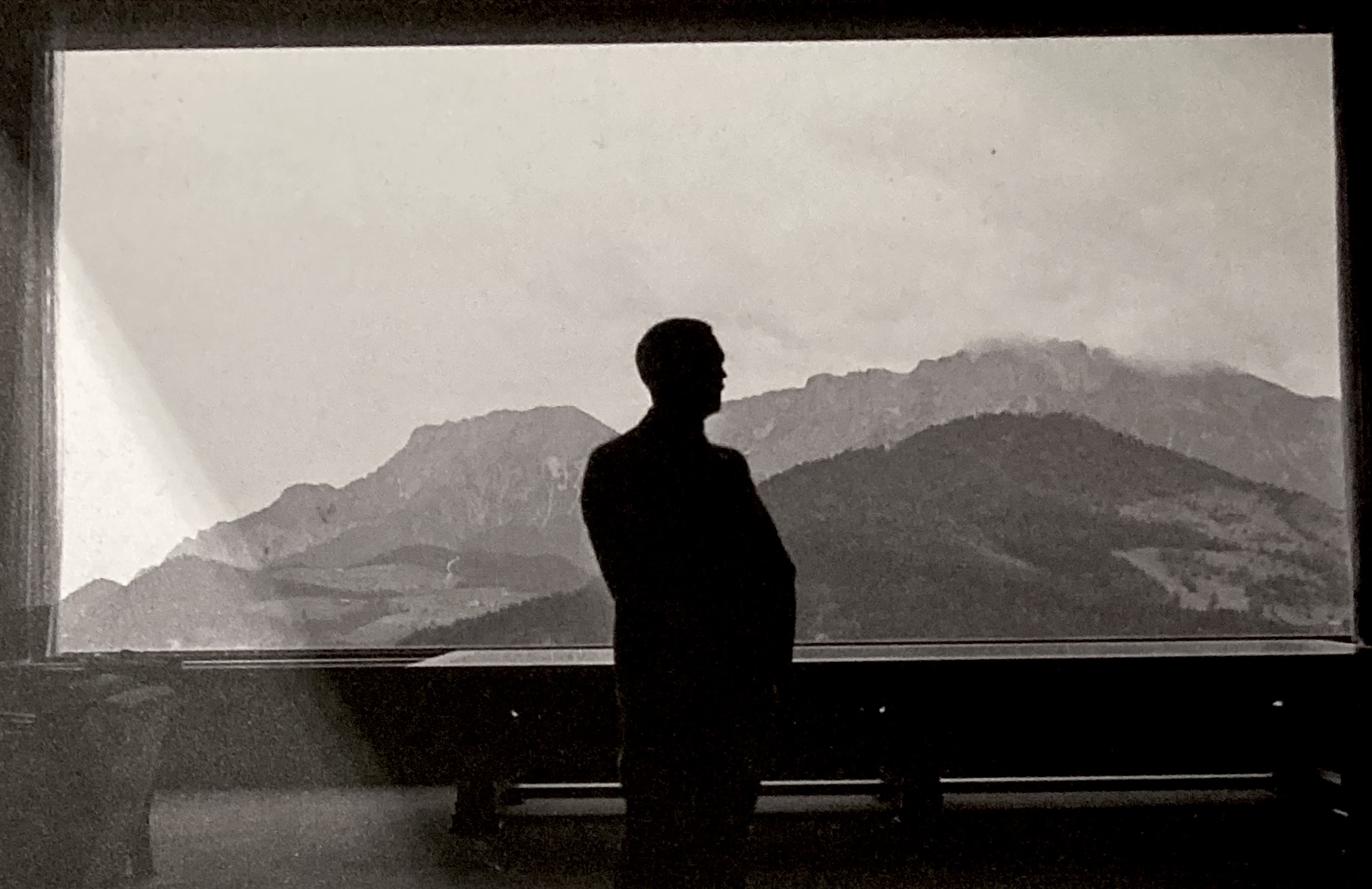 Photographer Hugo Jaeger captures Adolf Hitler standing in front of the lowered panorama window in the Great Hall of the Berghof, looking across the large conference table at the Untersberg mountain.