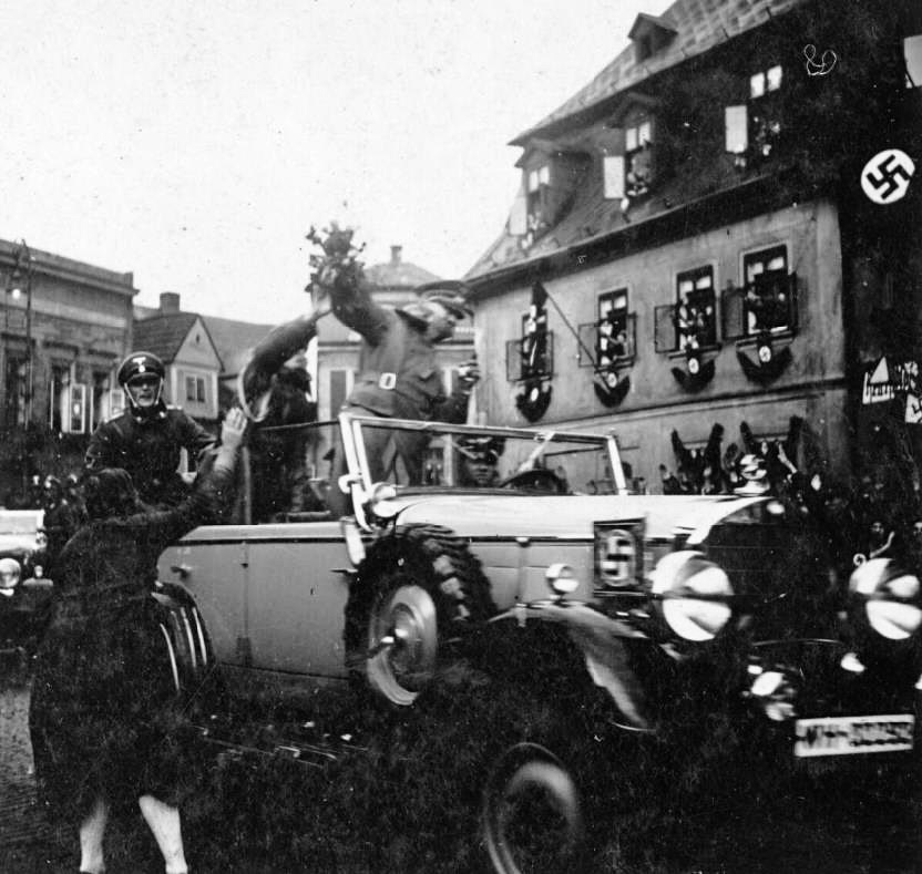 Adolf Hitler’s arrival in Loket on 4 October 1938. The photo captures a moment when Hitler was hit by a thrown flower bouquet by an overly enthusiastic young lady. Loket was the first town in the occupied Czech borderland that Hitler passed through at 12:10 p.m. It rained heavily all the way from Kraslice and Sokolov, and the “greatest of Germans” endured it with true Nordic toughness in an open car. His six-wheeled Mercedes had to literally weave through the dense crowd in places. In less than seven minutes, Hitler had left Loket behind. The rain stopped and the entourage stopped to eat a real soldier’s meal, peas with bacon. But Hitler only filled up vegetarianally – vegetable puree topped with fresh fruit. All the ingredients for his lunch came from the Loket area.