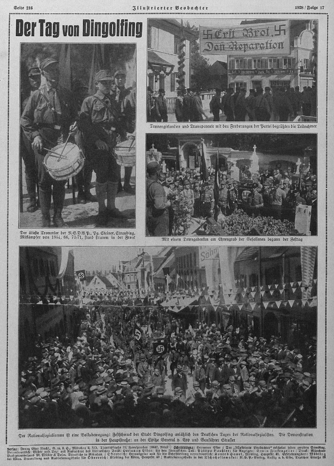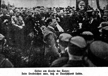 Adolf Hitler speaking at the funeral held on 13 March 1929 for one of the two victims of Die Blutnacht von Wöhrden. Otto Streibel, killed in action on 7 March 1929.